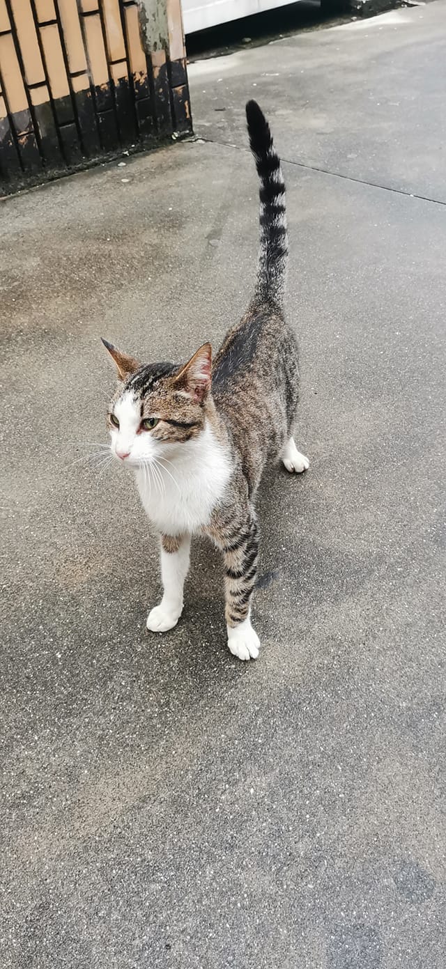 Este gato aparenta estar perdido. Se alguém conhecer está junto ao centro comercial.